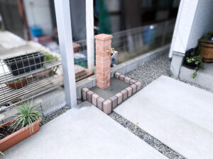 レンガ調のデザインがおしゃれな立水栓です。水受けはピンコロ石で囲い、ゴールドの蛇口がアクセントに。コンクリート土間と砂利敷きの庭に馴染む、温かみのあるデザインに仕上がりました。